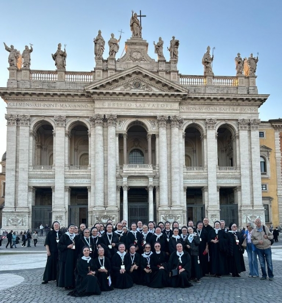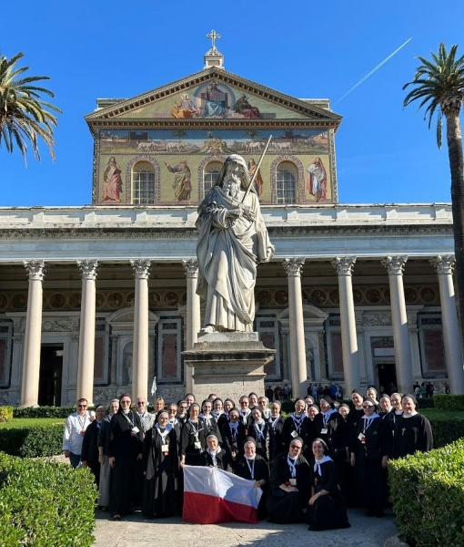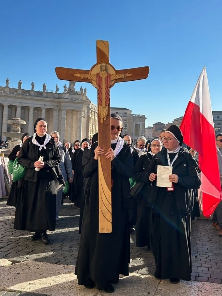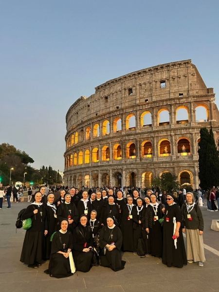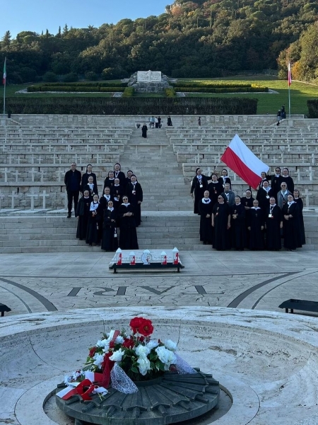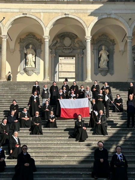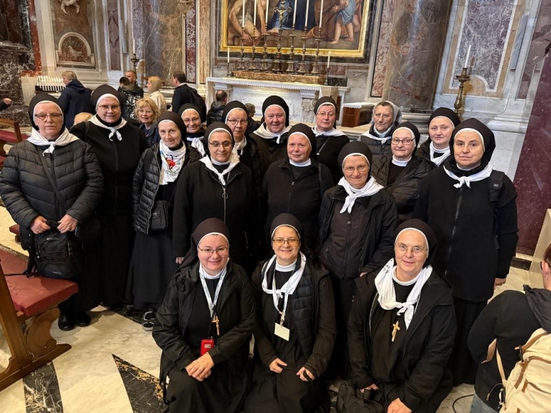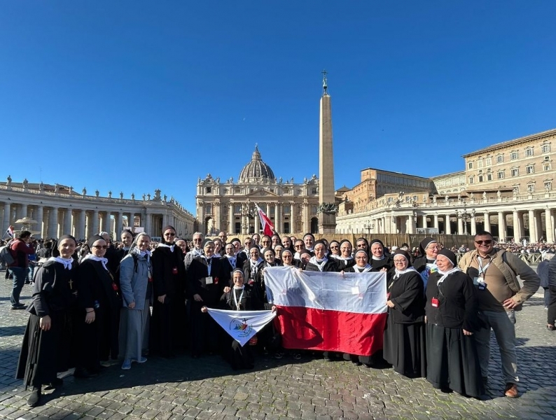 Siostry modliły się w Sanktuarium Matki Bożej Miłości, nawiedziły Bazylikę św. Pawła za Murami oraz Opactwo Tre Fontane, miejsce męczeńskiej śmierci Apostoła Narodów. Głębokim doświadczeniem była również wizyta w Muzeach Watykańskich i kontemplacja piękna Kaplicy Sykstyńskiej. W szczególny sposób siostry przeżywały modlitwę w Bazylice Najświętszego Zbawiciela, św. Jana Chrzciciela i św. Jana Ewangelisty na Lateranie – Matce i Głowie wszystkich kościołów świata. Poruszającym momentem było także przejście Świętych Schodów oraz adoracja relikwii Męki Pańskiej w Sanktuarium św. Krzyża w Jerozolimie. W programie nie zabrakło również spotkania z pięknem Rzymu Barokowego i Starożytnego, w tym nawiedzenia Panteonu. Siostry czterokrotnie przekroczyły Drzwi Święte, powierzając Panu swoje intencje i dziękczynienie. Uczestniczyły też w audiencji z Papieżem Leonem oraz w głęboko poruszającej Mszy świętej przy grobie św. Jana Pawła II. Szczególnie uroczystym wydarzeniem była procesja Drogą Jubileuszową z krzyżem pielgrzymim, prowadząca przez via della Conciliazione do Bazyliki św. Piotra. Ważnym doświadczeniem duchowym było również nawiedzenie Bazyliki Santa Maria Maggiore i modlitwa przy grobie papieża Franciszka. Ważnym etapem pielgrzymki był wyjazd na Monte Cassino. W ciszy i zadumie siostry odwiedziły Opactwo Benedyktynów oraz Polski Cmentarz Wojenny, powierzając Bogu tych, którzy oddali życie za Ojczyznę. Wspólne wykonanie pieśni „Czerwone maki na Monte Cassino” stało się poruszającym aktem pamięci i wdzięczności. Opiekunem duchowym pielgrzymki był ks. Bogdan Sarniak, kapłan archidiecezji krakowskiej. Nad organizacją i przebiegiem pielgrzymki czuwał pilot, pan Jacek Sarniak, z biura pielgrzymkowego Beskid Travel. Był to czas obfity w łaski, umocnienia i doświadczenie wspólnoty. Chwała Bogu za ten święty czas i wdzięczność wszystkim, którzy się do niego przyczynili.