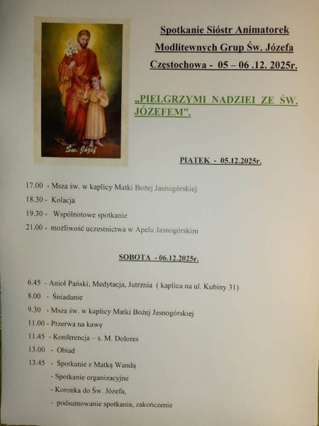 Józefowego Domu, z radością dzieliły się Bożym działaniem w każdej z Grup, ich prężnością i aktywnością Członków w dziele zgłębiania, praktykowania i szerzenia kultu do Patrona Kościoła św. Nadto debatowano nad tym m.in., by działalność MGSJ była jeszcze bardziej owocna także poprzez ulepszanie ich struktur, eliminowanie braków i zastosowanie rozmaitych środków do tego prowadzących. Matka Wanda w ramach wygłoszonej konferencji podziękowała siostrom za zaangażowane w szerzeniu kultu św. Józefa wśród jego Czcicieli. Nadto, dziękując za prowadzenie Grup, zwróciła uwagę na apostolski wymiar miłości bliźniego w praktyce, szerzonej na wzór św. Józefa. Treści te jak i inne ważne zagadnienia poruszone zostały także w zaproponowanej przez Matkę ankiecie. Natomiast zaproszony nasz Józefolog - s. Dolores Siuta, jednocześnie animatorka krakowskiej MGSJ, przybliżyła siostrom postać naszego głównego Patrona w aspekcie jego zawierzenia Bogu na wszystkich odcinkach życia i nadziei, która cierpienie potrafi przemienić w duchową radość. Wszystkiemu towarzyszyła modlitewna emanacja z Maryjnego Sanktuarium, w którym uczestniczki spotkania mogły spędzić nieco czasu, włączając się w Eucharystie i korzystając z osobistego trwania przed Cudownym Obrazem Częstochowskiej Pani. Spotkanie przebiegało zgodnie z załączonym programem, choć godziny dzielenia się funkcjonowaniem poszczególnych Grup znacznie przekroczyły przewidziany na to czas. W spotkaniu nie zabrakło siostrzanych gestów szczególnej wdzięczności i gratulacji dla s. M. Teresilli Ziober - długoletniej animatorki i koordynatorki MGSJ, wciąż animującej MGSJ w Częstochowie, która w 2026 r. będzie świętowała swój 50-letni Jubileusz życia zakonnego. Siostry animatorki powracały do swoich wspólnot zapalone jeszcze większym entuzjazmem i pragnieniem niesienia nadziei ludziom na sposób i w duchu naszego wielkiego Patrona i Ojca św. Józefa.