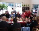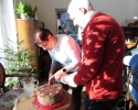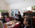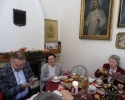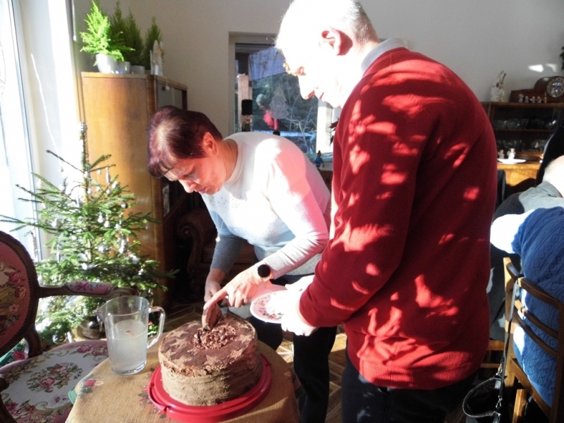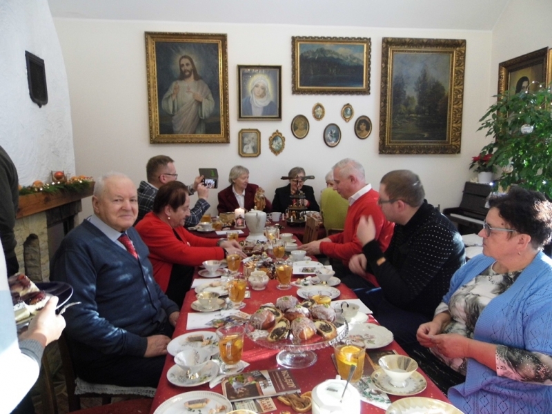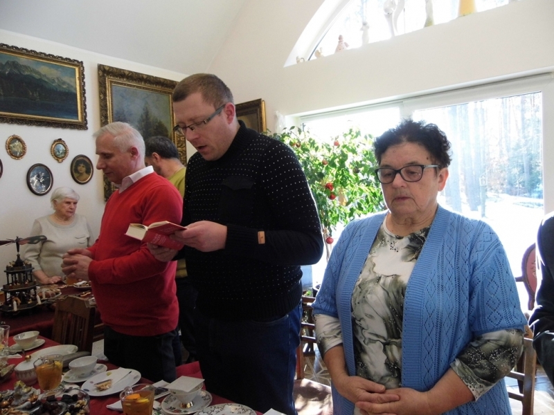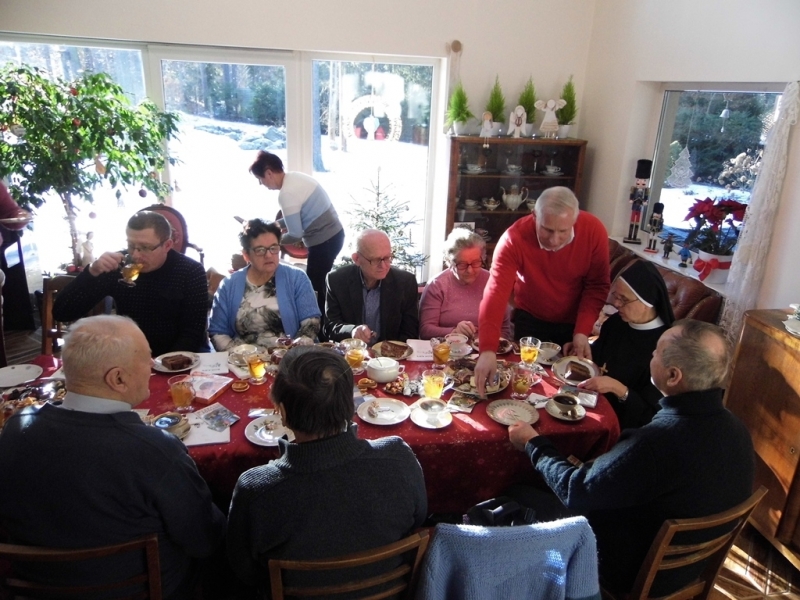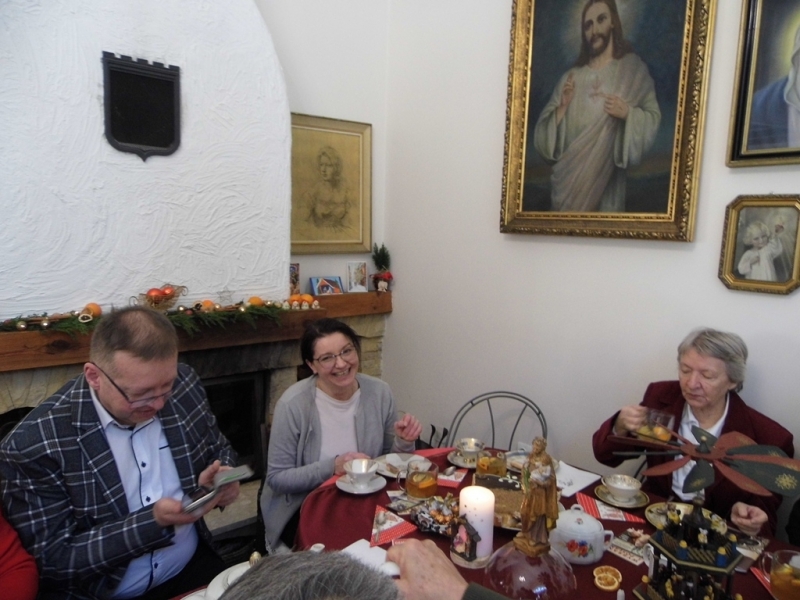 od Matki generalnej Wandy Matysik, S. Franciszki Bogusławskiej - koordynatorki generalnej MGSJ i, przy dzieleniu się opłatkiem, od siebie. Było nas ponad 20 osób i jakiś czas trwał gwar przy dzieleniu się opłatkiem, gdy nasza pani muzyk Alicja dała znak grą na skrzypcach, że czas zacząć śpiewanie kolęd. Serdeczna atmosfera i słowa kolęd zrodziły w niektórych z nas pytania, dlaczego zdarza nam się spotykać ludzi, którzy potrafią wykonywać dobre uczynki dla innych, szczególnie w okresie około bożonarodzeniowym, a nie uczestniczą w życiu Kościoła. S. Ancella wyjaśniła nam, że Bóg kocha wszystkich i każdego pociąga do Siebie, jednak wiara jest łaską. Pomogła nam jak odróżnić łaskę uświęcającą od łaski uczynkowej. Śpiew kolęd i rozmowy wyciszało spożywanie smakowitości, które przygotowali członkowie MGSJ. Pan Tomek upiekł smaczny, tradycyjny, duży, okrągły tort, a panie inne słodkości. Po odmówieniu Koronki do Miłosierdzia Bożego spotkanie jeszcze trwało ponad godzinę, ale zapadał zimowy zmierzch i trzeba było zbierać się, aby szczęśliwie dojechać do domów, chociaż na szczęście przejezdnymi drogami.